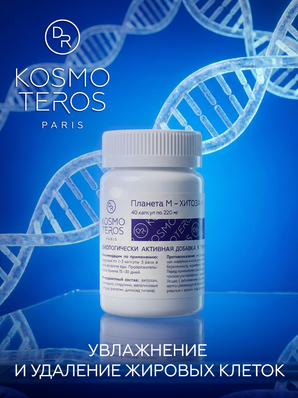 «Планета М-Хитозан» — это комплексный биокорректор-нутрицевтик французской аптечной косметики премиум-класса Dr KOSMOTEROS (Paris), созданной по строгим требованиям международного стандарта ECOCERT для интенсивного ухода за лицом, представляет собой сбалансированный комплекс липосорбента-хитозана, полученного из панциря камчатского краба, водорослей спирулины и ламинарии японской. Является одним из лучших увлажнителей благодаря своей совместимости со структурой кожи и способности образовывать влагоудерживающую пленку, которая сама впитывает влагу из окружающей среды, насыщая ею эпидермис, и в то же время позволяет коже дышать, защищает ее от агрессивных факторов и УФ-излучения. Входящие в состав биокорректора глюкозаминаликаны, витамины и микроэлементы:
