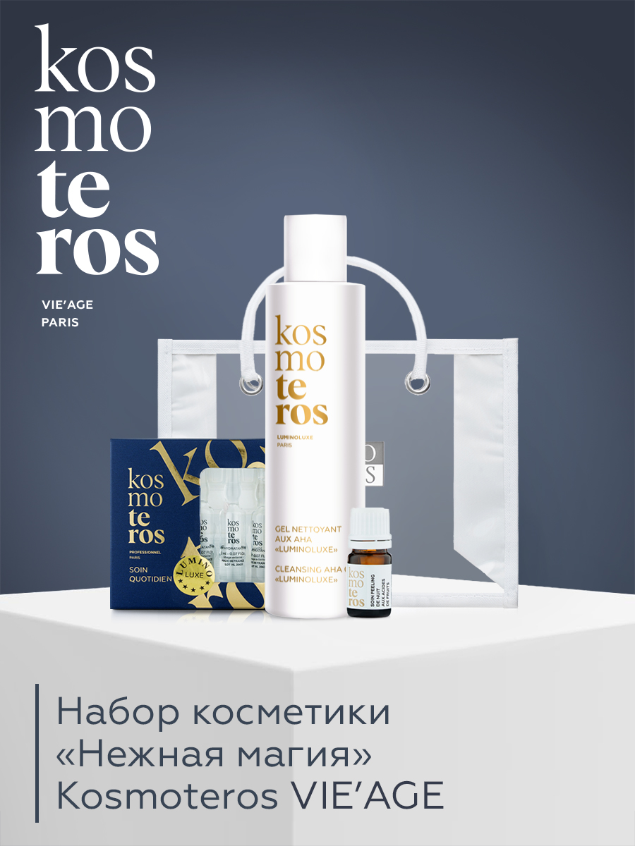 Набор «Нежная магия» от французской профессиональной уходовой косметики премиум класса KOSMOTEROS VIE’AGE (Paris) в фирменной сумочке - это тщательно подобранные эффективные косметические средства с высоким совместным anti-age действием в дневное и ночное время суток. Очищающий Гель с AHA и ниацинамидом совместно с мягким ночным пилингом с фруктовыми кислотами усиливают омолаживающий эффект применения высококонцентрированной ампульной Суперувлажняющей сыворотки с трипептидами каменной розы «HYATURON». Результат: кожа напитана, упругая и светится изнутри — словно после профессиональной процедуры люминотерапии. Благодаря компактному формату набора, его удобно брать в поездки.