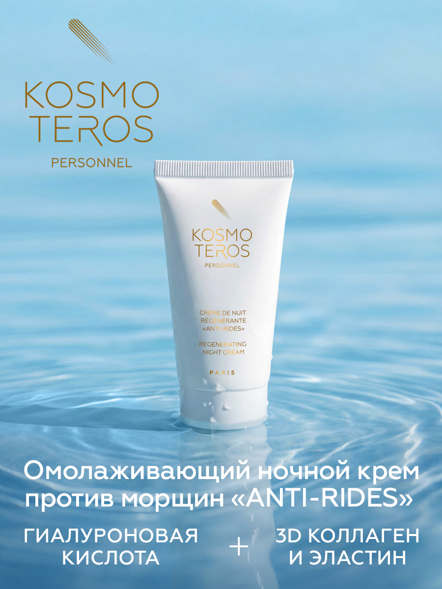 Омолаживающий ночной крем для лица увлажняющий «ANTI-RIDES» французской уходовой косметики для лица премиум-класса KOSMOTEROS PERSONNEL (Paris) как крем от морщин обеспечивает интенсивный антивозрастной уход за лицом, который работает в период ночной регенерации кожи. Сочетая в формуле морской коллаген, эластин и гиалуроновую кислоту, а также мощный anti-age комплекс тауринов, высококонцентрированный увлажняющий крем для лица воздействует на ключевые механизмы старения кожи: