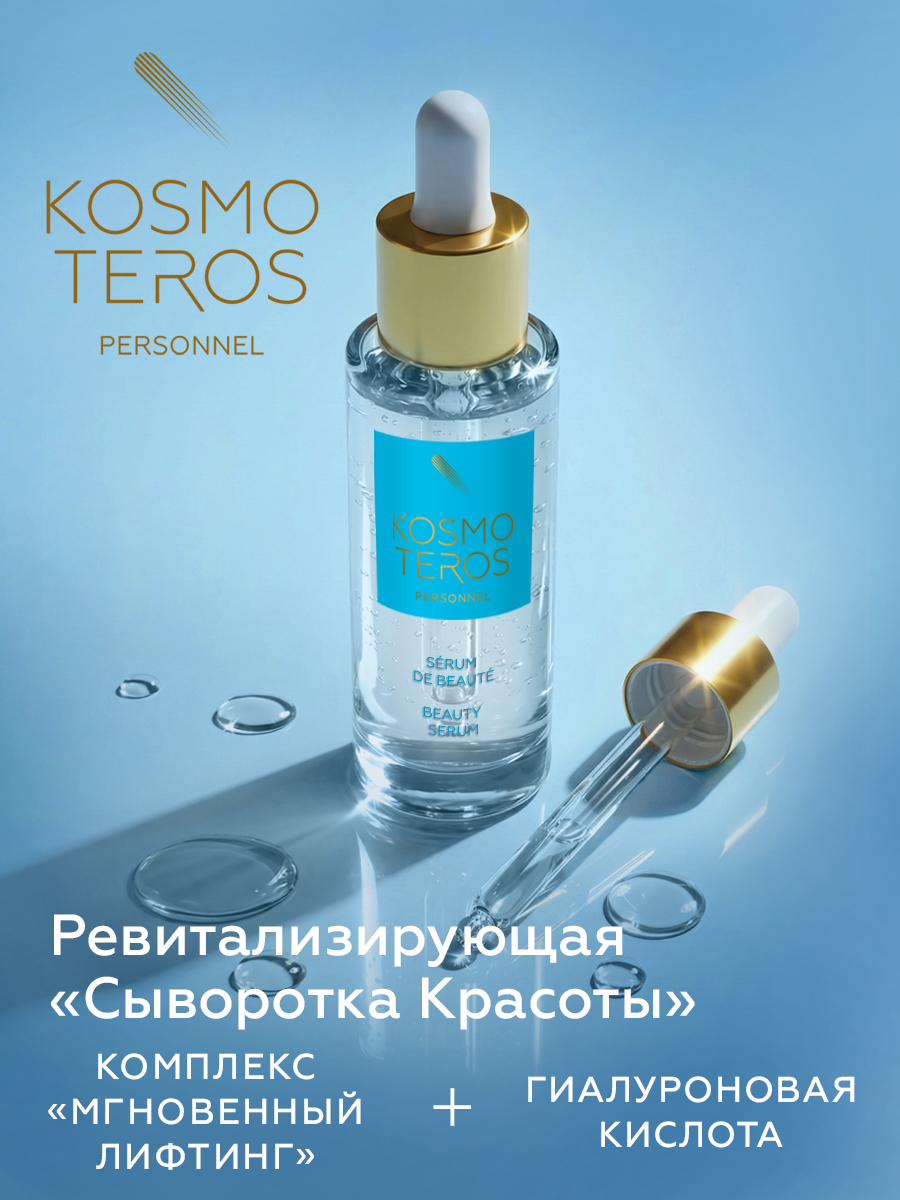 Ревитализирующая лифтинг сыворотка увлажняющая для лица французской уходовой косметики для лица премиум-класса KOSMOTEROS PERSONNEL (Paris) обеспечивает ежедневный комплексный anti-age уход за лицом как антивозрастная сыворотка и сыворотка от морщин, активизируя естественные механизмы омоложения кожи. Благодаря комбинации многофракционной гиалуроновой кислоты, белков коллагена и эластина, а также лифтинг-комплекса мгновенного действия лифтинг сыворотка для лица увлажняющая комплексно воздействует на кожу, обеспечивая: